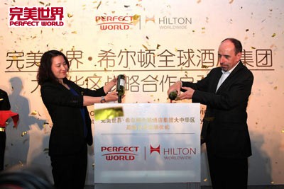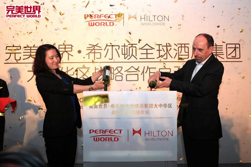 2011年3月15日下午,完美世界与希尔顿全球酒店集团大中华区战略合作发布会在金茂三亚希尔顿大酒店召开。希尔顿全球酒店集团大中华区营运部副总裁蒂莫西苏博先生、代理市场总监叶丽薇女士、完美世界副总裁王雨云女士出席了此次战略合作发布会,并代表企业致词。金茂三亚希尔顿大酒店是希尔顿全球酒店集团在中国建设的第一家度假酒店,完美世界和希尔顿全球酒店集团大中华区的此次战略合作,更是开创了一项新的世界第一,双方将合作在完美世界旗下知名网游《热舞派对》中,建立全球首家虚拟五星级酒店。这一举措不仅显示出了双方高层领导人独到的战略眼光,而且开创了网游行业与酒店行业强强联手、共创辉煌的新篇章,这种“鼠标+酒店”式的合作模式,实现了虚拟世界与现实世界的完美对接。